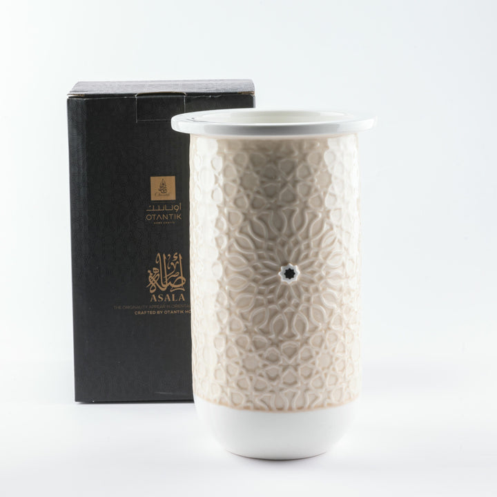Showcase the elegance of Asalah's porcelain vase, featuring luxurious Islamic engravings suitable for modern, refined interiors. To ensure its longevity, follow these maintenance tips: