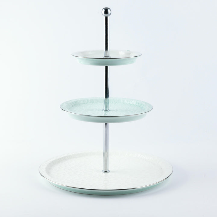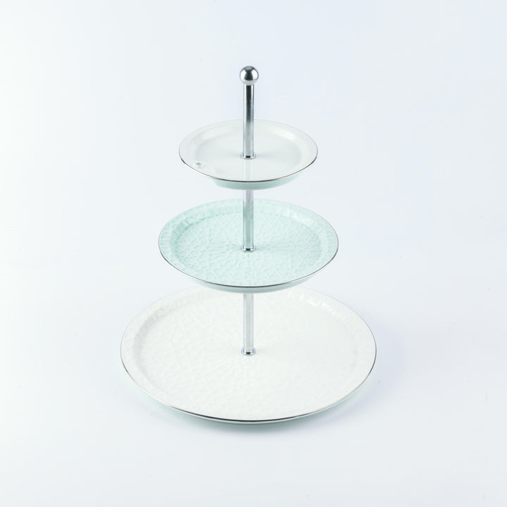 Enjoy serving and displaying food and desserts with elegance using this three-tier serving stand of varying sizes. This stand features a design that allows for perfect food organization and an attractive presentation, making it an ideal choice for special occasions and family gatherings. The multi-tiered design offers ample space to display a variety of foods in an orderly and beautiful manner while adding a touch of elegance and sophistication to your table.