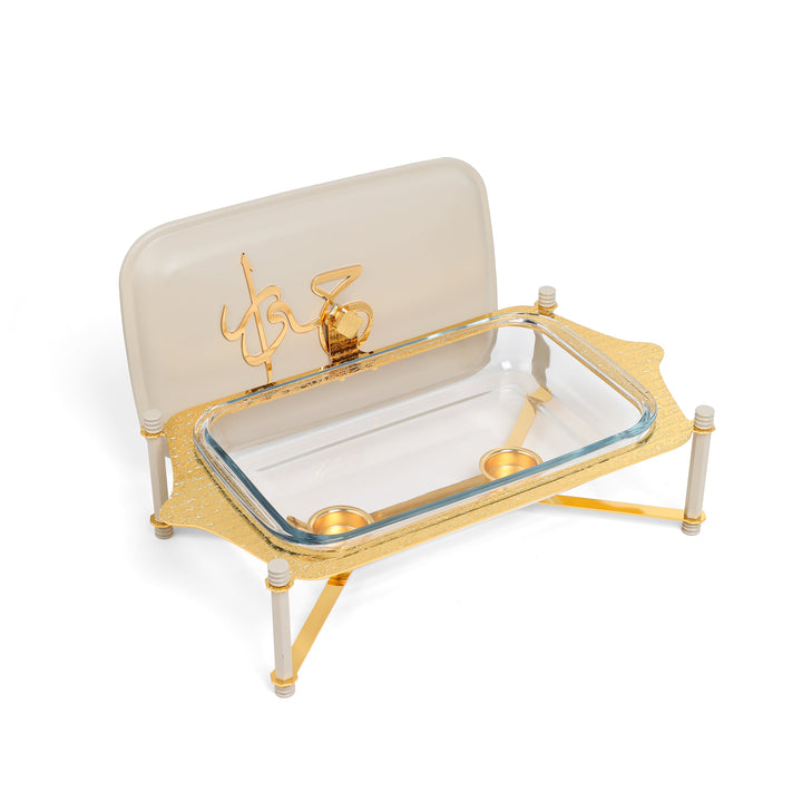 It comes with a lid that adds a touch of luxury, decorated with Arabic calligraphy spelling "Jiwar," which also helps to preserve the food.