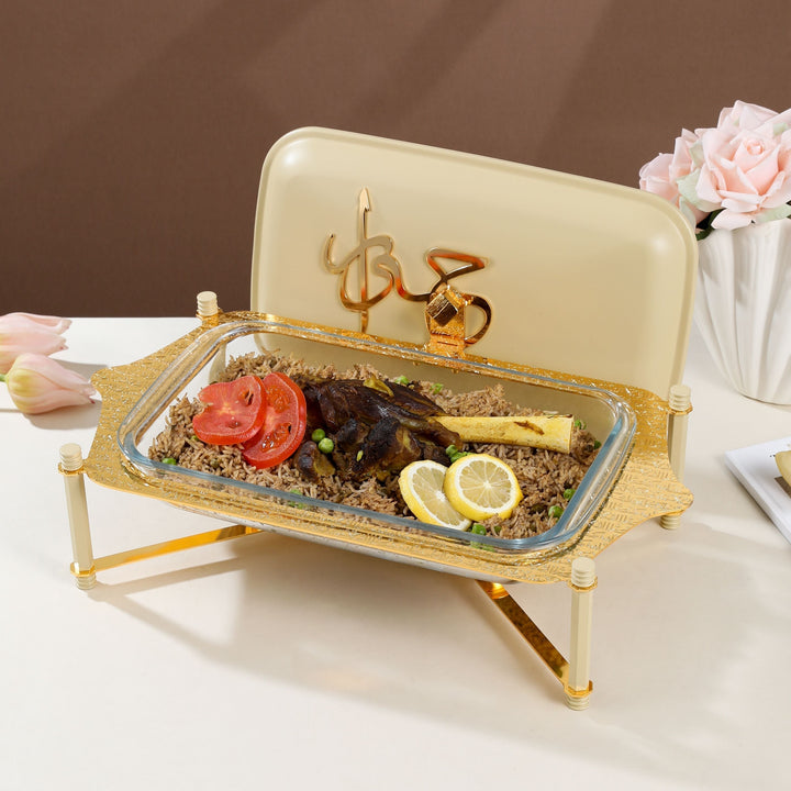 It comes with a lid that adds a touch of luxury, decorated with Arabic calligraphy spelling "Jiwar," which also helps to preserve the food.
