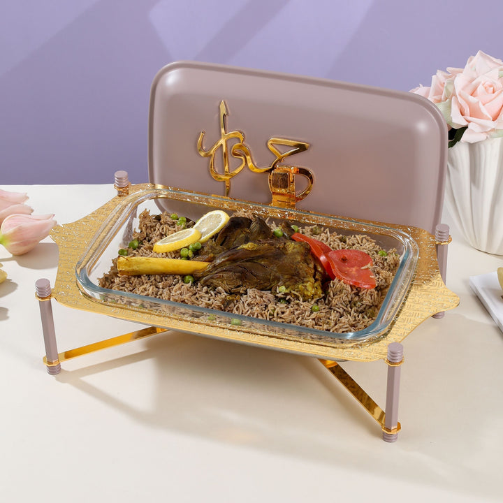 It comes with a lid that adds a touch of luxury, decorated with Arabic calligraphy spelling "Jiwar," which also helps to preserve the food.