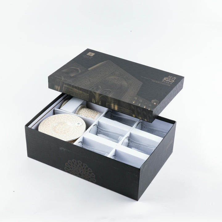 Enjoy special moments with the Tea Glass Set 13 Pcs From Asalah, a brand that embodies luxury and elegance through its exceptional design and attention to the finest details. This set stands out for its seamless blend of sophistication and tradition, making it a practical choice that adds a touch of grandeur to your table. Despite its modern design, it reflects authentic Arab heritage thanks to its unique decorations. If you wish to acquire this set, it will add a unique and elegant touch to your table.